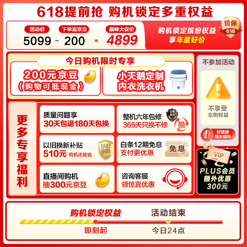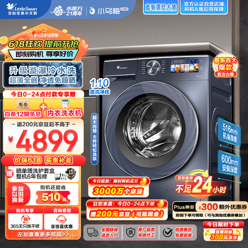 小天鹅(LittleSwan)滚筒洗衣机全自动 超薄全嵌【小乌梅高奢版TD100VIC】洗烘一体机 516mm机身 蓝氧特渍净 10公斤价格:5099.00元!