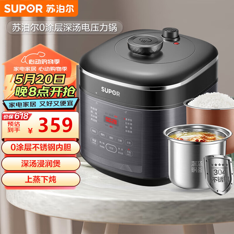 苏泊尔(SUPOR)深汤系列电锅5L家用智能预约 0涂层钢釜 上蒸下煮大屏面板 煲汤SY-50FC8708双胆高压锅3-6人价格:349.00元!
