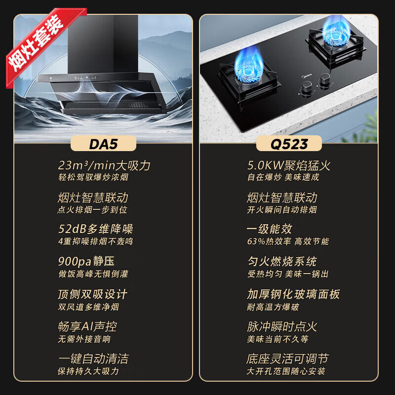 美的(Midea)【24年新品AI语音控制】顶侧双吸抽油烟机燃气灶套装家用23立方大吸力自清洗排烟机DA5烟灶两件套 【烟灶联动套装-天然气】搭配5.0KW猛火灶价格:3199.00元!