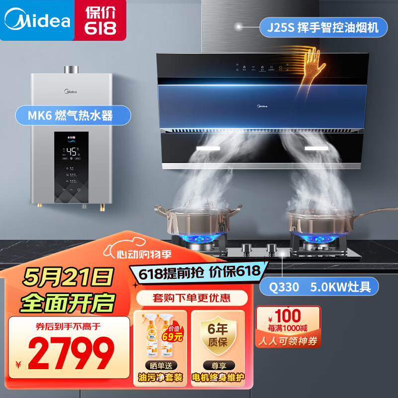 美的(Midea)【烟灶热水器套购】侧吸式21大吸力5.0kW火力烟灶J25S+Q330天然气搭16升热水器MK6价格:2999.00元!