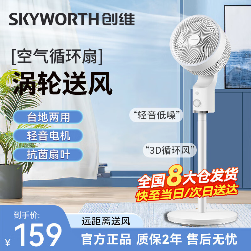 创维(Skyworth)空气循环扇落地扇智电风扇家用大风力轻音台地两用循环风扇Q858白色价格:159.00元!