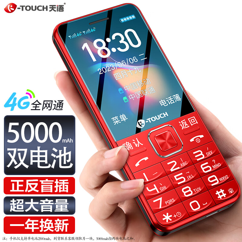 天语(K-Touch)S6 老人手机4G通移动联通电信版超长待机双卡双待学生老年手机功能机 魅力红价格:145.00元!