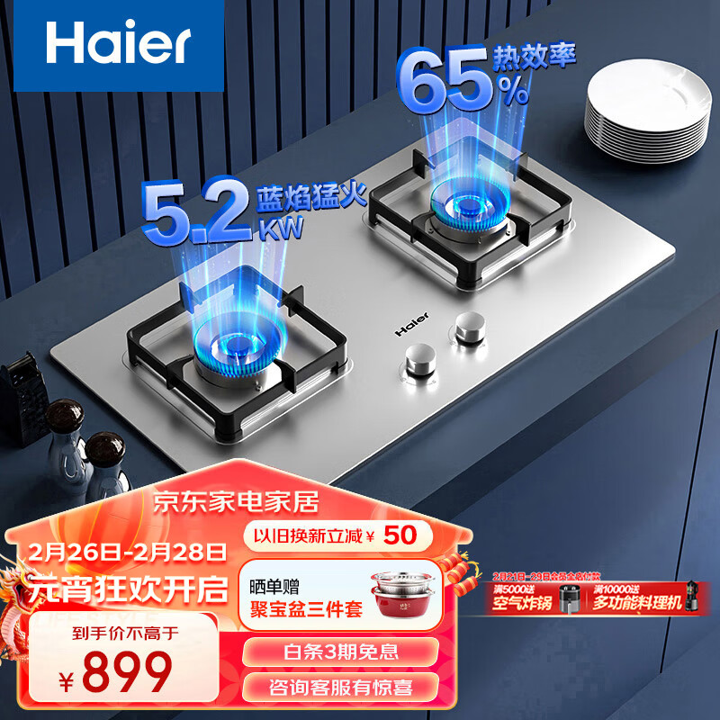 海尔(Haier)燃气灶双灶家用 天然气不锈钢灶具 5.2kw纯蓝火焰 65%热效易洁耐高温 台嵌两用JZT-Q2GE2(12T)价格:899.00元!