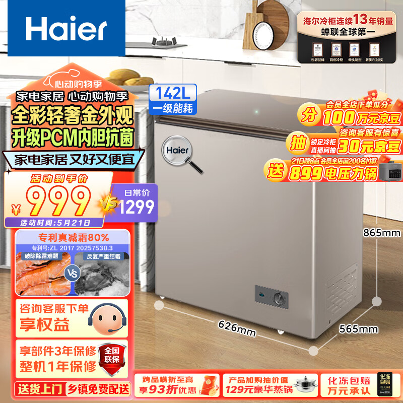 海尔(Haier)142升低霜小冰柜家用商用 冷藏柜冷冻柜冰柜小型租房用小冰箱小型冷柜BC/BD-142GHPCD 以旧换新价格:999.00元!