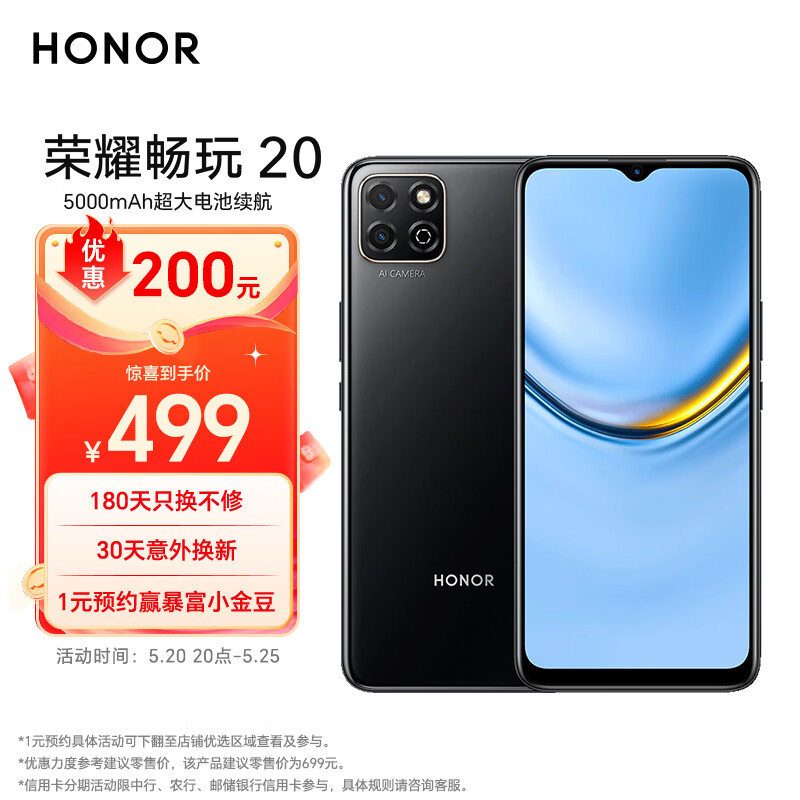 荣耀畅玩20 5000mAh超大电池续航 6.5英寸大屏 莱茵护眼 老人 4GB+64GB 幻夜黑价格:499.00元!
