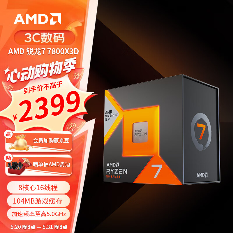 AMD 锐龙7 7800x3D游戏处理器(r7) 8核16线程 104MB游戏缓存 加速频率至高5.0GHz 盒装CPU价格:2399.00元!