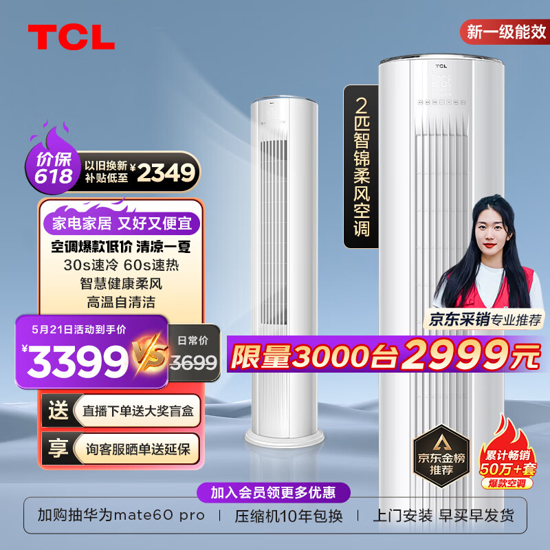 TCL空调 2匹 新一级能效 智锦 变频冷暖柜机 空调立式 客厅空调KFRd-51LW/D-JD11Bp(B1)以旧换新价格:2999.00元!