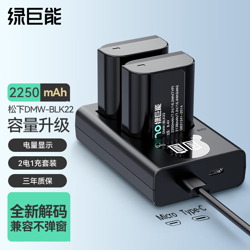 绿巨能(llano)松下DMW-BLK22相机电池S5电池充电器DC-S5M2/GH6/GH5M2全画幅微单相机电池 两电双充套装价格:209.00元!