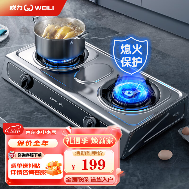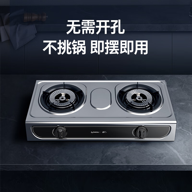 威力(WEILI)燃气灶具家用台式不锈钢色燃气灶免打孔双灶具大火力煤气炉煤气灶WLT4(天然气)价格:199.00元!