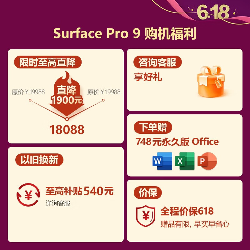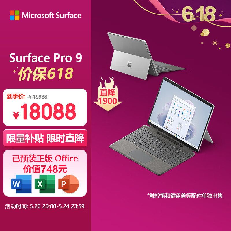 微软Surface Pro 9 二合一平板电脑 i7/32G/1T亮铂金 13英寸高刷触控 高端办公 教育学习 笔记本电脑价格:18088.00元!