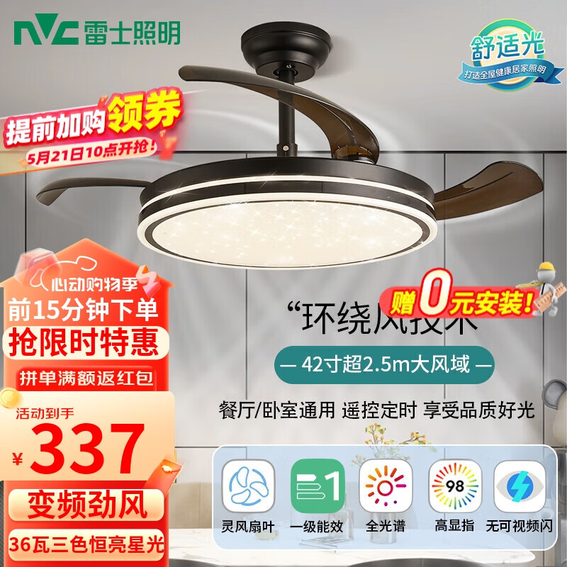 雷士(NVC)风扇灯吊扇灯北欧餐厅卧室黑色led灯具全光谱1级能效遥控42寸36瓦价格:595.00元!