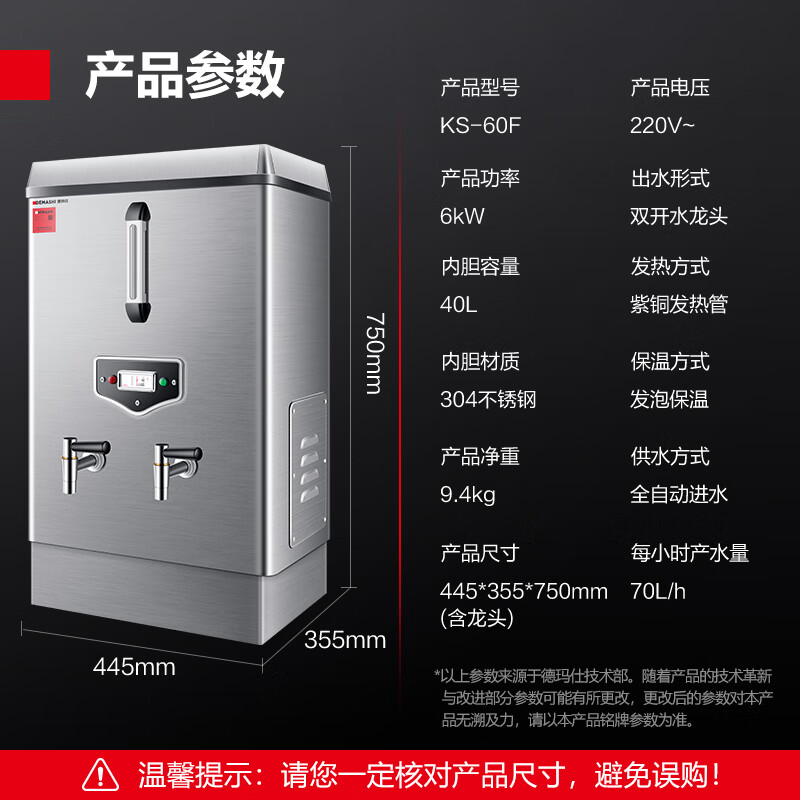 德玛仕(DEMASHI)开水器商用 电热开水机 全自动进水 304不锈钢 烧水器商用 KS-60F(发泡款)220V价格:899.00元!