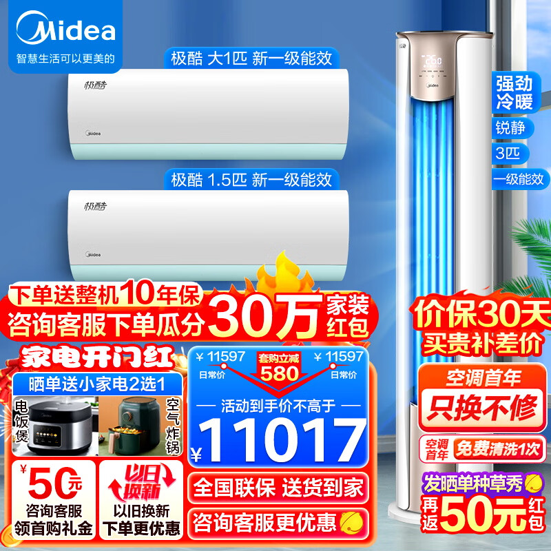 美的(Midea)新一级能效 空调套装 二室一厅 锐静+极酷 省电节能套餐 变频冷暖空调 72VHC1+35VHA1+26VHA1价格:10867.00元!