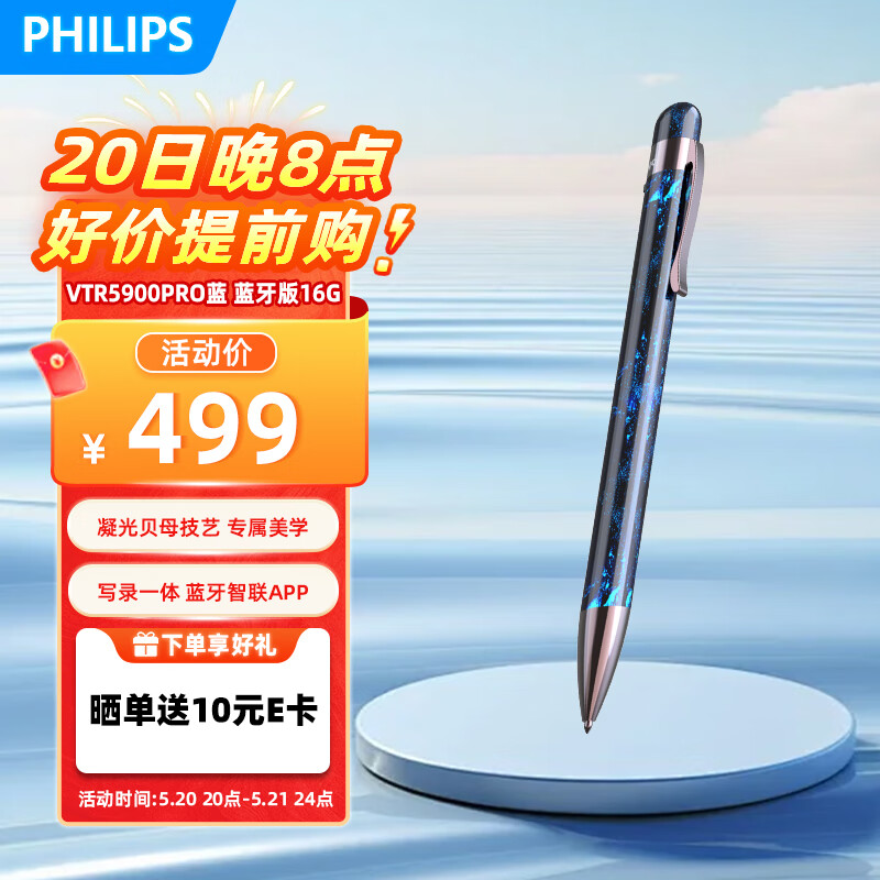 飞利浦(PHILIPS)录音笔VTR5900Pro 星空蓝 专业语音转文字高清降噪便携一键操作录音器16G蓝牙版价格:499.00元!