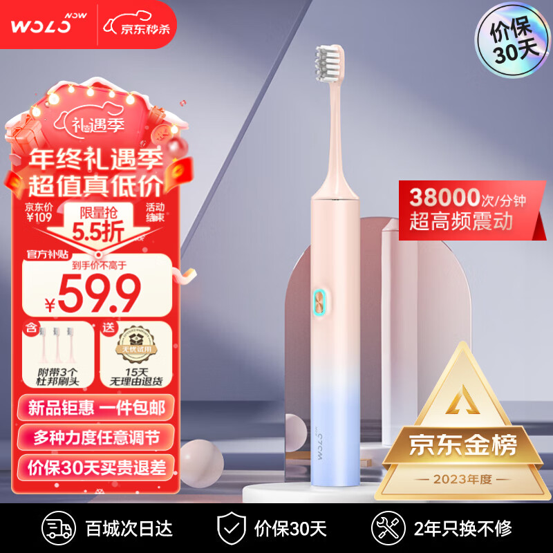 沃乐小米有品电动牙刷4种模式3挡力度38000次高频声波震动洁齿成人 情侣生日礼物男送女友 粉色价格:99.90元!