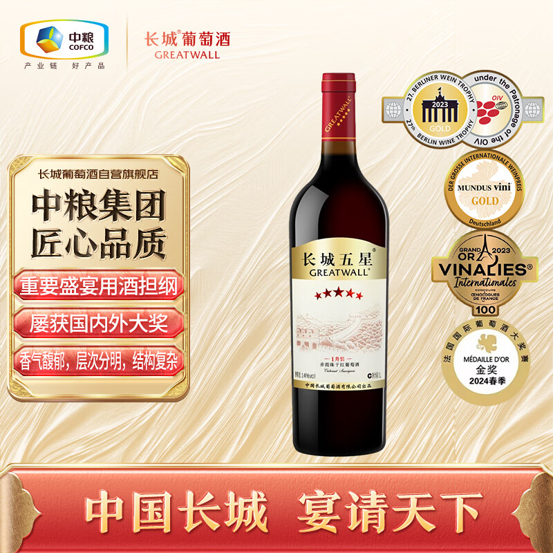 长城 五星赤霞珠干红葡萄酒 1000ml 单瓶装价格:485.00元!