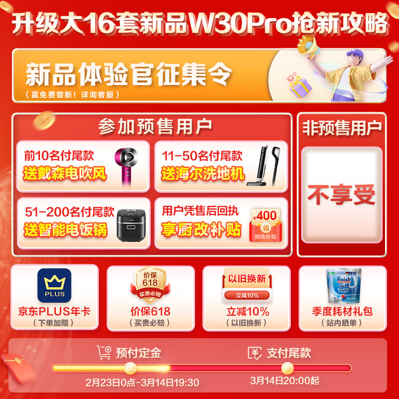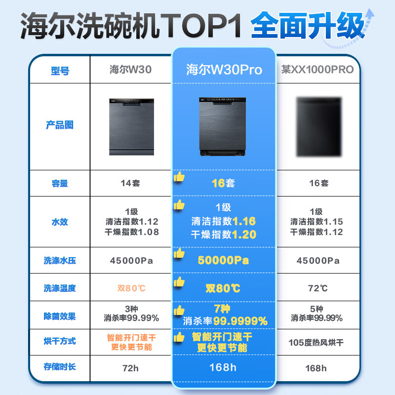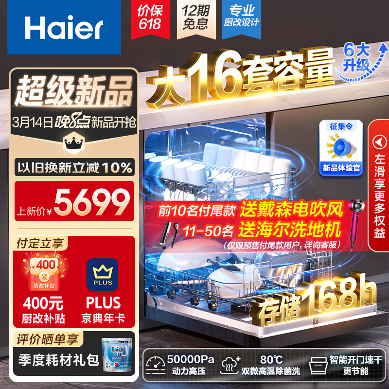 海尔(Haier)16套大容量嵌入式家用晶彩洗碗机W30Pro 6大升级 洗消一体 智能开门速干EYBW164286GGU1价格:5699.00元!