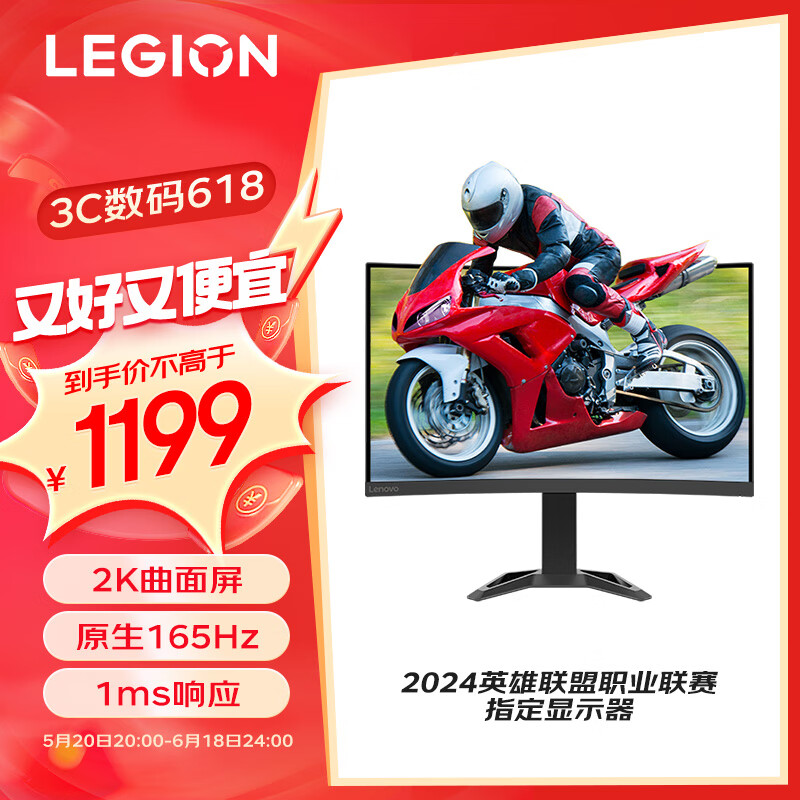 联想(Lenovo)拯救者27英寸2K曲面 原生165Hz 低蓝光 FreeSync 1ms HDR10 升降俯仰 音箱 电竞显示器G27qc-30价格:1199.00元!