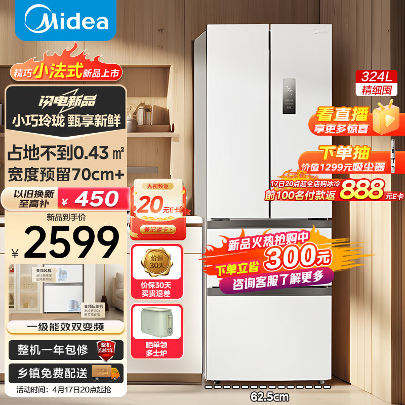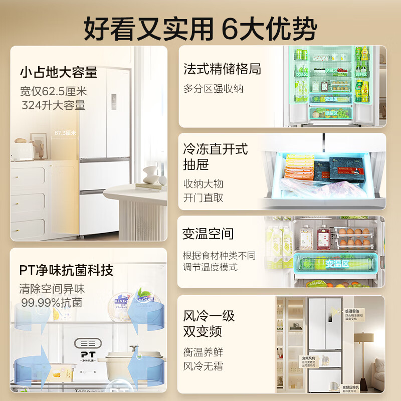 美的(Midea)340一级能效双变频法式多门四开门小型白色家用电冰箱超薄风冷无霜节能低噪MR-340WFPE价格:2899.00元!