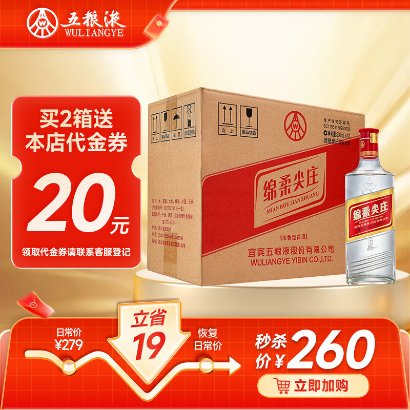 五粮液 绵柔尖庄 光瓶131 浓香型白酒 50度 500ml*12瓶 整箱装价格:260.00元!