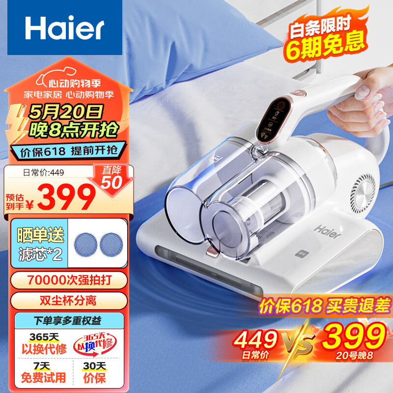 海尔(haier)除螨仪双杯尘螨分离家用床上除螨虫紫外线杀菌大吸力吸尘神器7万次拍打CX5W价格:399.00元!