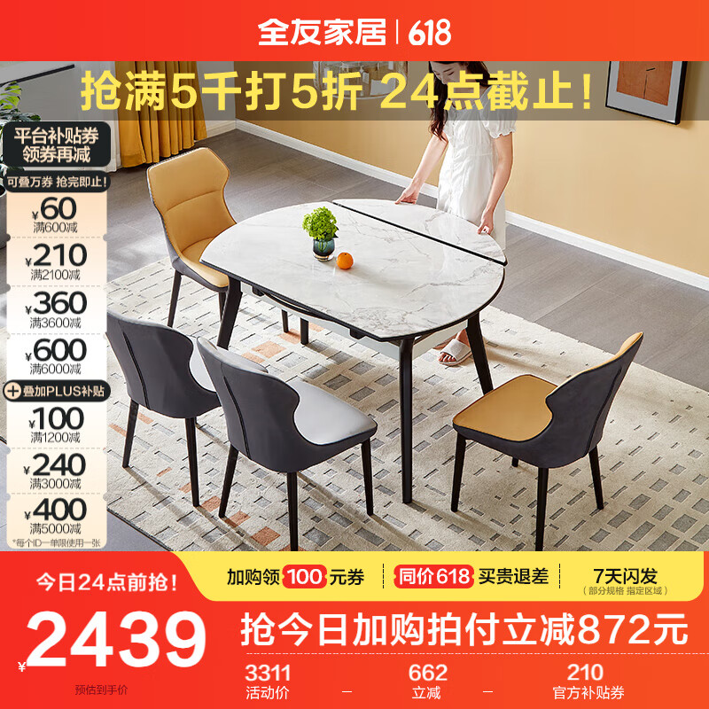 全友家居 现代轻奢岩板折叠餐桌可方可圆伸缩家用桌子饭桌家具DW1059价格:3311.25元!