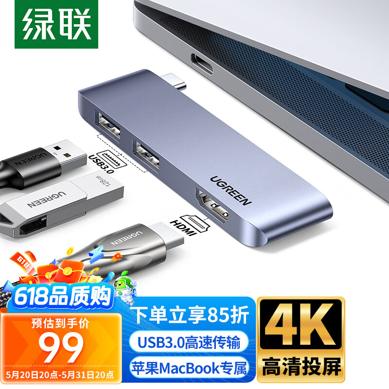 绿联Type-C扩展坞USB-C转HDMI4K高清投屏转换器HUB分线器3.0直插式拓展坞适用苹果MacBook笔记本集线器价格:116.47元!