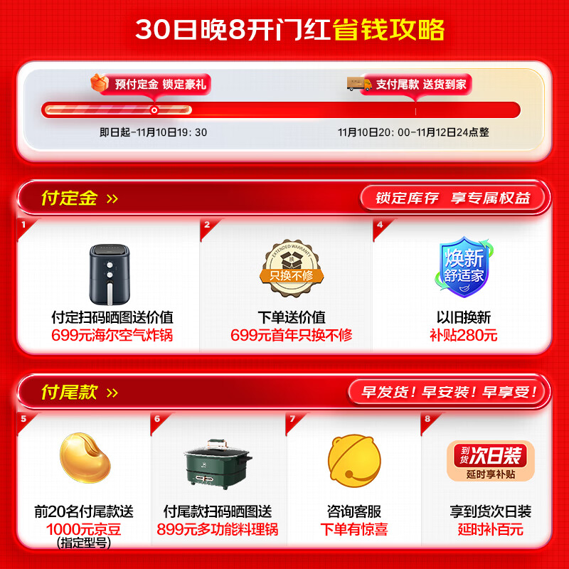 4、家里还在装修中,双十一在京东把所有家电都买好了,京东给力空调热水器海尔,洗衣机油烟机云米。还没安装,装修完安装好再来追评。