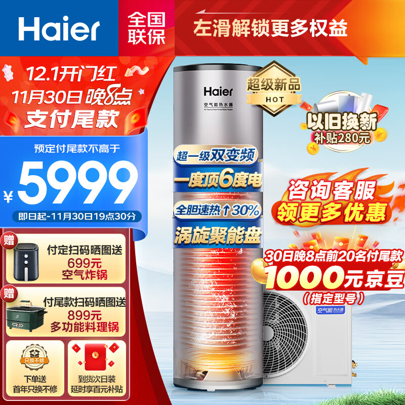 海尔(Haier)空气能热水器200升包安装 超一级能效全变频净水洗 升级R32冷媒 WIFI智控 KF200-T7U1(3-5人)价格:5999.00元!