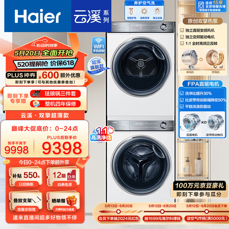海尔(Haier)云溪376W洗烘套装 10KG精华洗滚筒洗衣机全自动+双擎热泵烘干机 超薄平嵌 376LWU1+376W 以旧换新价格:9998.00元!