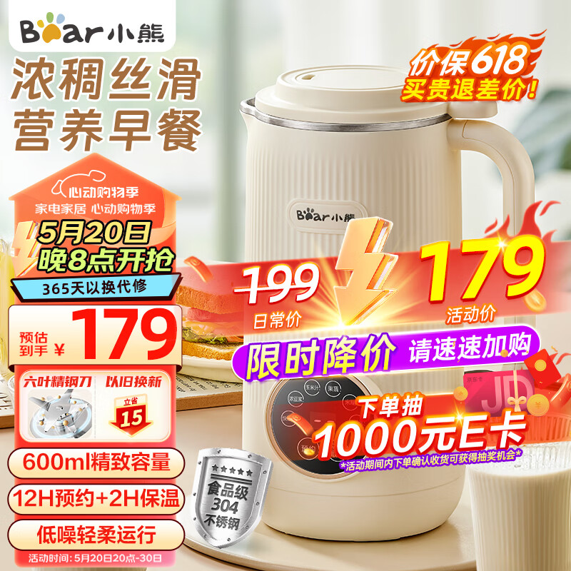 小熊(Bear)豆浆机 破壁机小型 家用小型米糊机 多功能全自动清洗免过滤 1-2人食 DJJ-D06X3 0.6L价格:179.00元!