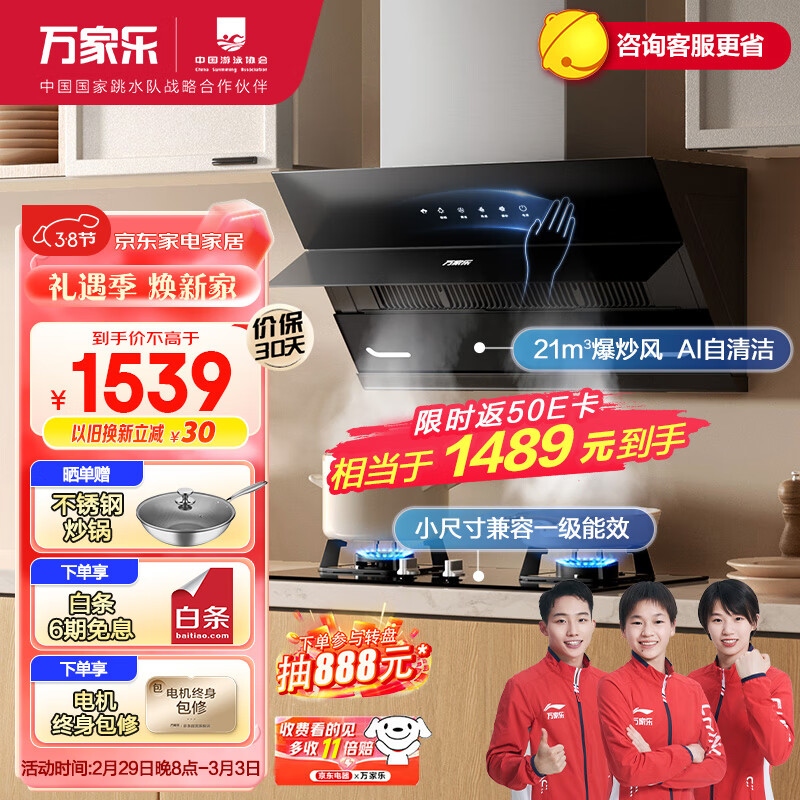万家乐 抽油烟机 侧吸式自清洗21m3/min大吸力挥手智控烟灶套装家用油烟机燃气灶具套装AJ4+KA032B天然气价格:1739.00元!
