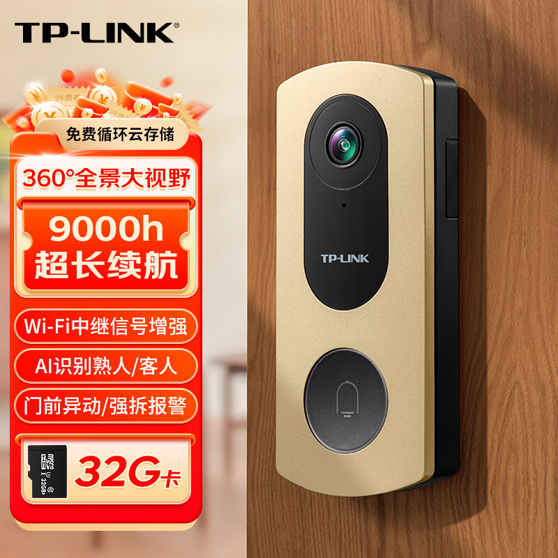 TP-link 可视门铃摄像头家用监控智能摄像机电子猫眼智能门铃无线wifi视频通话 DB53E香槟金 32G卡套装价格:435.00元!