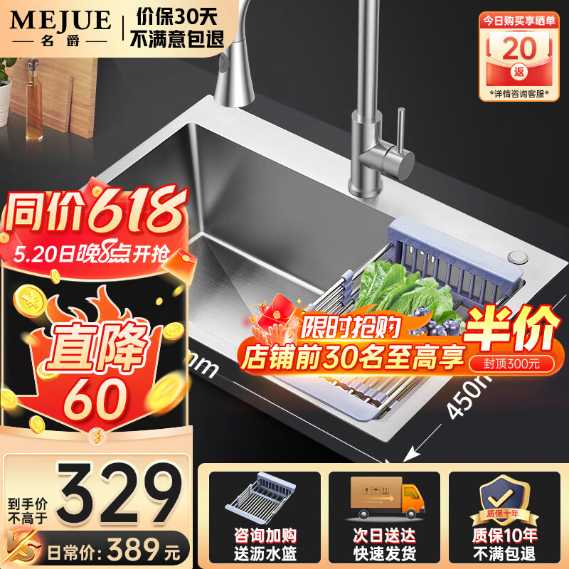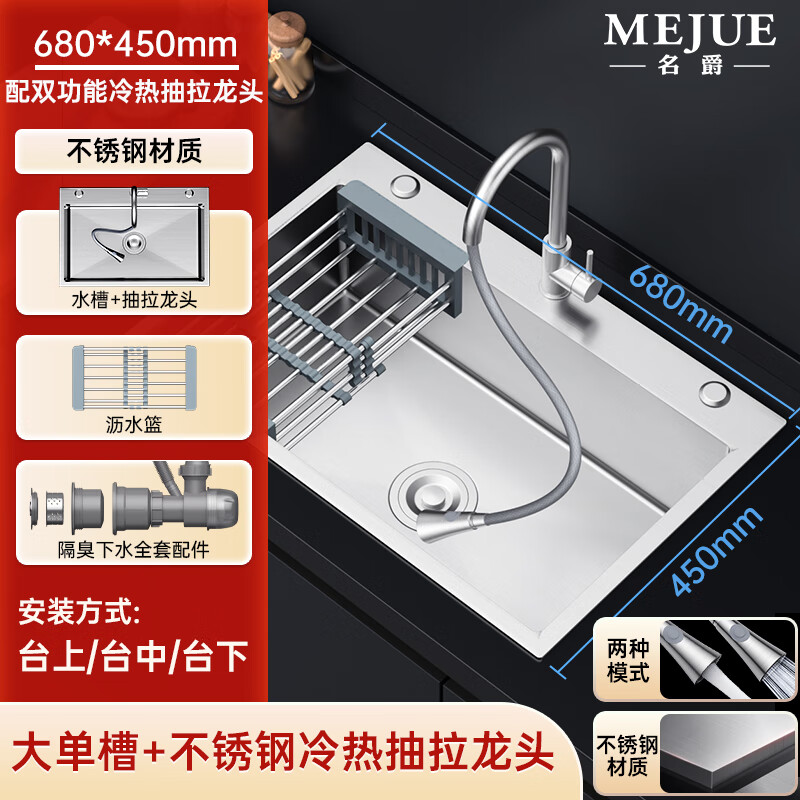 名爵(MEJUE)水槽厨房不锈钢洗碗池洗菜盆一体盆单槽水池手工盆+抽拉龙头2465价格:389.00元!