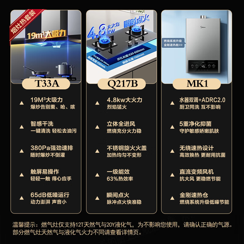 美的(Midea)家用抽油烟机19立方大吸力顶吸油烟机燃气灶具热水器三件烟灶套装天然气厨房电器T33A+Q217+22-MK1价格:2298.00元!