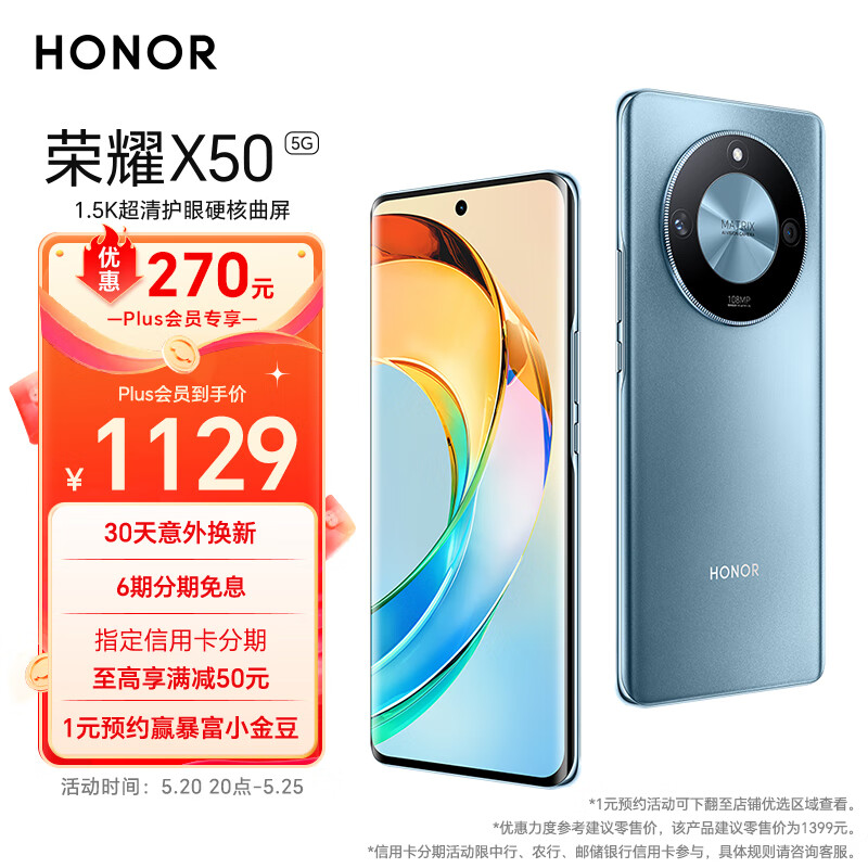 荣耀X50 代骁龙6芯片 1.5K超清护眼硬核曲屏 5800mAh超耐久大电池 5G手机 8GB+128GB 勃朗蓝价格:1229.00元!