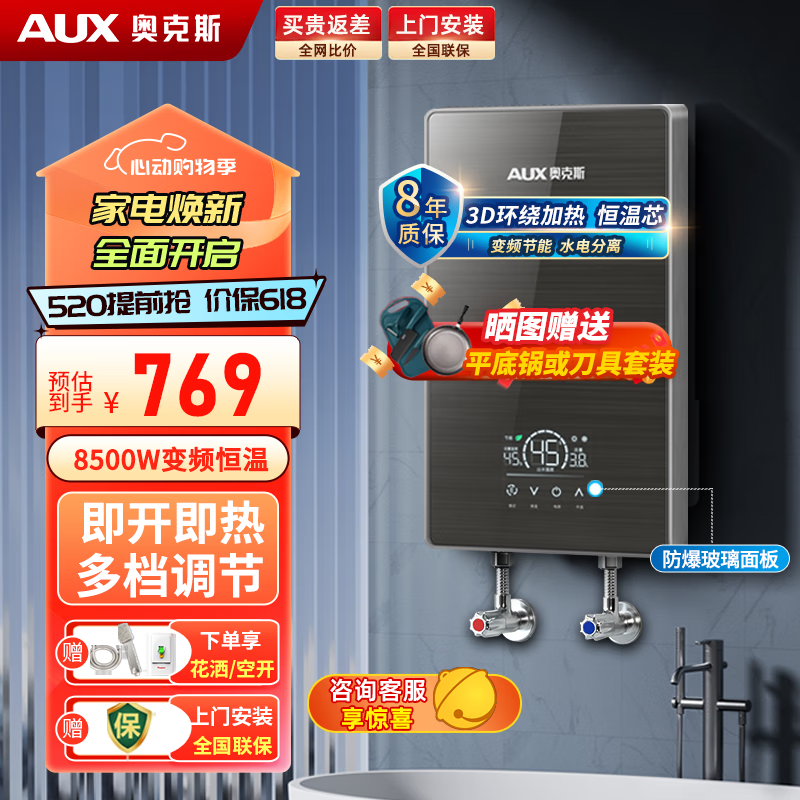 奥克斯(AUX)即热式电热水器电 速热智能变频多功率可调家用卫生间洗澡小型超薄热水宝即开即热恒温免储水 8500W 变频恒温+水电分离【升级银河灰】价格:768.00元!