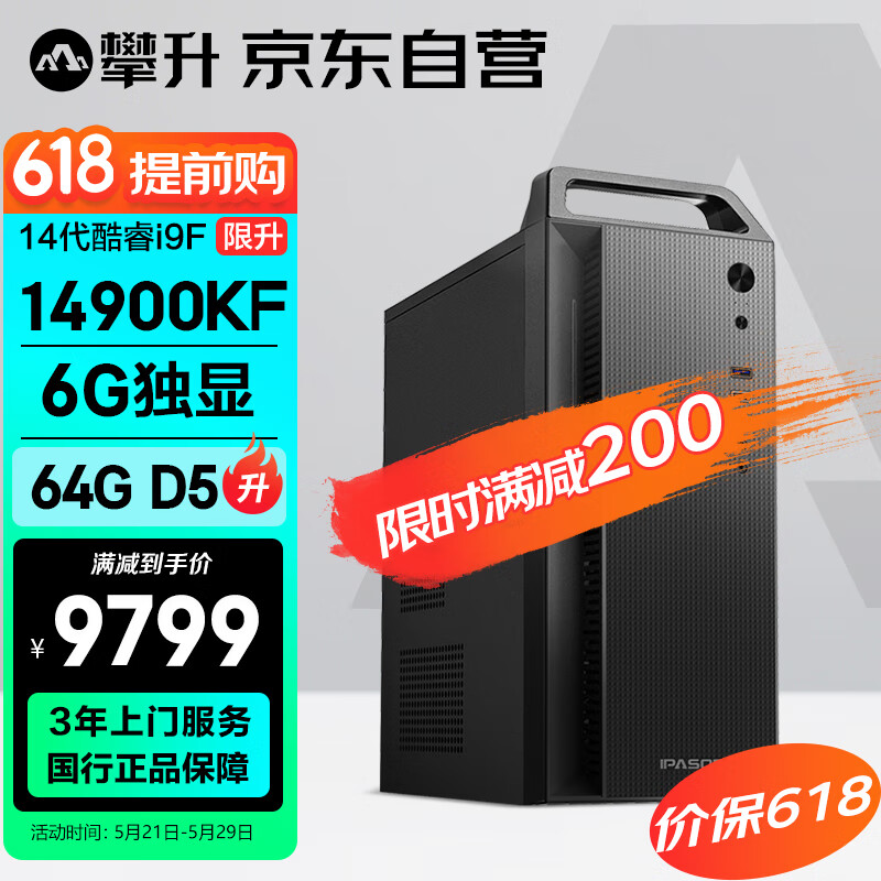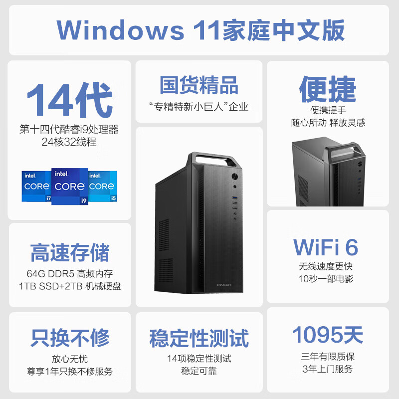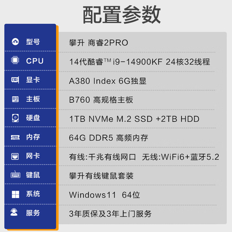 攀升 商睿2PRO 设计师办公商用台式电脑台式机组装电脑主机全套(14代酷睿i9K 64GD5 1T+2T 6G独显)价格:9999.00元!