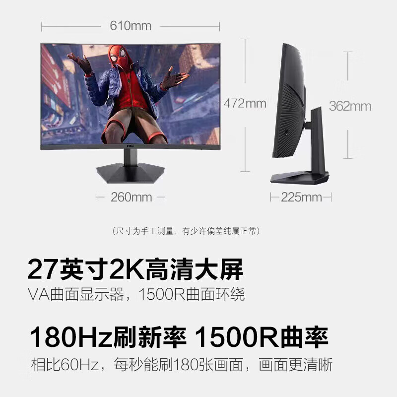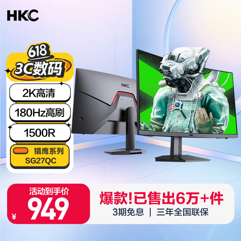 HKC 27英寸2K高清180Hz专业电竞1500R曲面屏幕HVA快速液晶hdmi吃鸡游戏不闪屏网咖电脑显示器SG27QC价格:1149.00元!