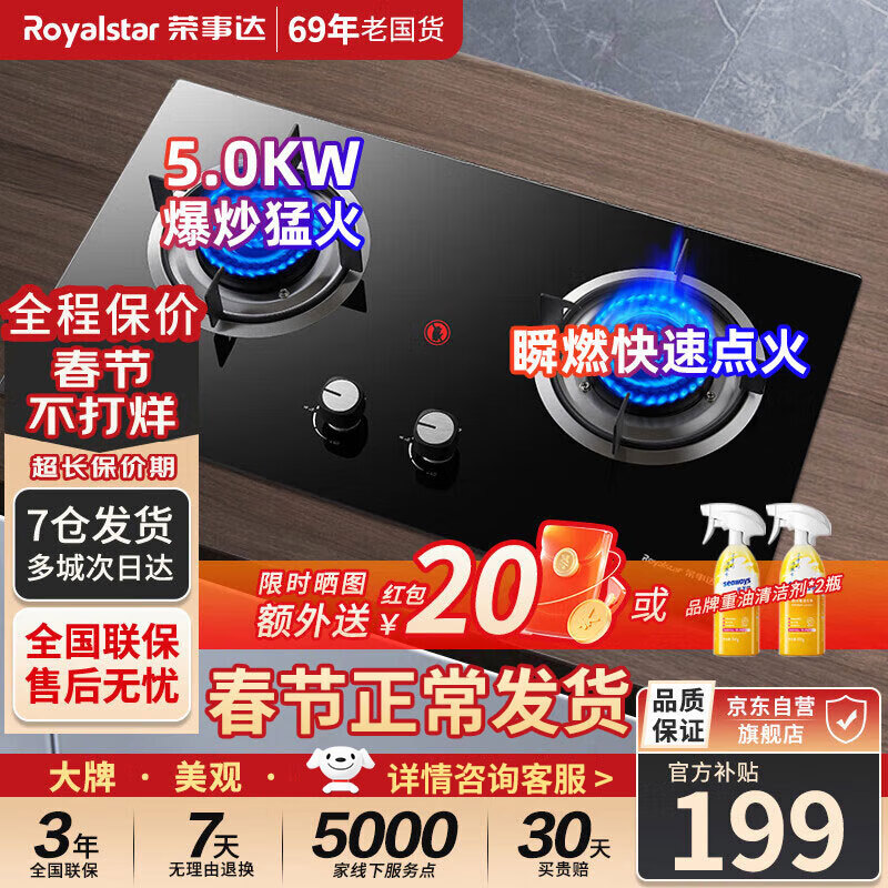 荣事达燃气灶煤气灶双灶天然气灶家用5.0kw大火力猛火灶大面板燃气灶嵌入式煤气灶双灶R202Y[家电]价格:198.00元!