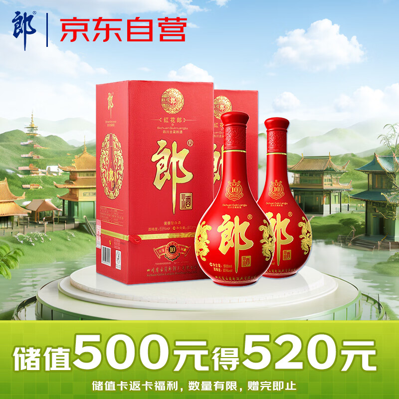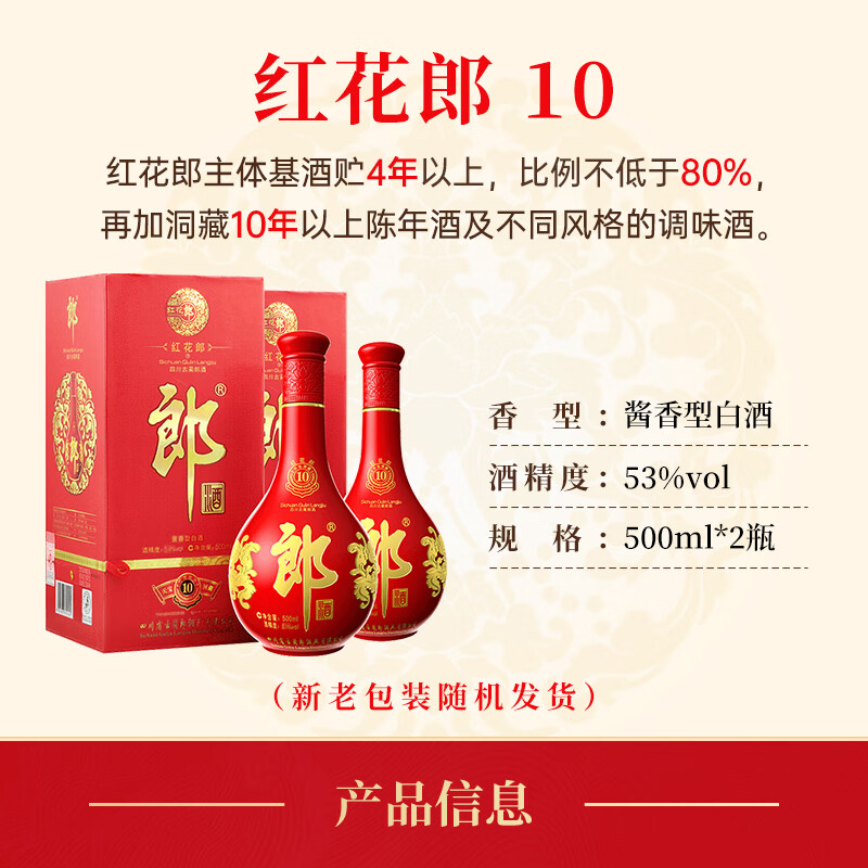 郎酒 红花郎10 酱香型白酒 53度 500ml*2瓶 双瓶装价格:700.00元!