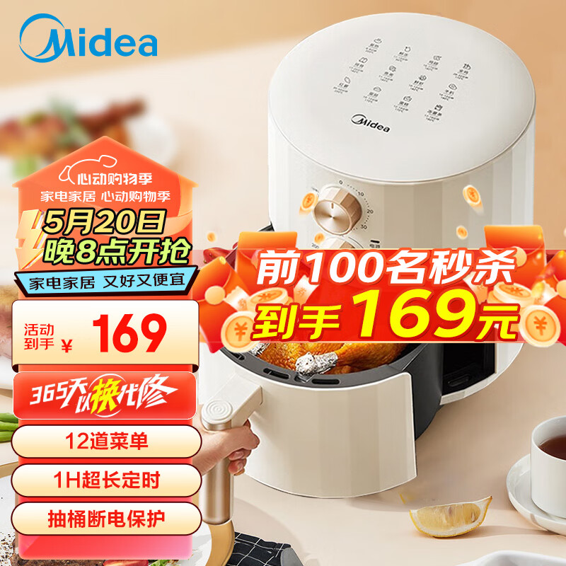 美的(Midea) 空气炸锅家用 大容量多功能智能全自动不粘内胆大功率空气烤箱 MF-KZE5006【5升旋钮款】 5L 大容量价格:259.00元!