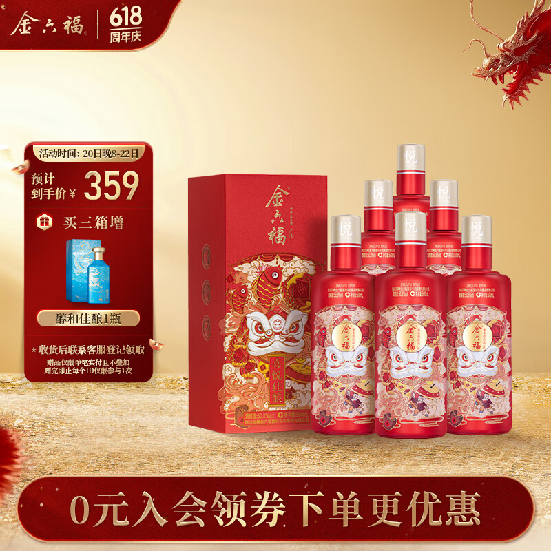 金六福 喜悦佳酿 50.8度 500ml*6 整箱装 浓清兼香型白酒【婚宴用酒】价格:359.00元!