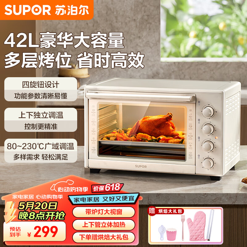 苏泊尔(SUPOR)家用多功能大容量42L电烤箱 上下独立控温大视窗带炉灯多层烤位 专业烘焙奶油白OJ42A802价格:299.00元!