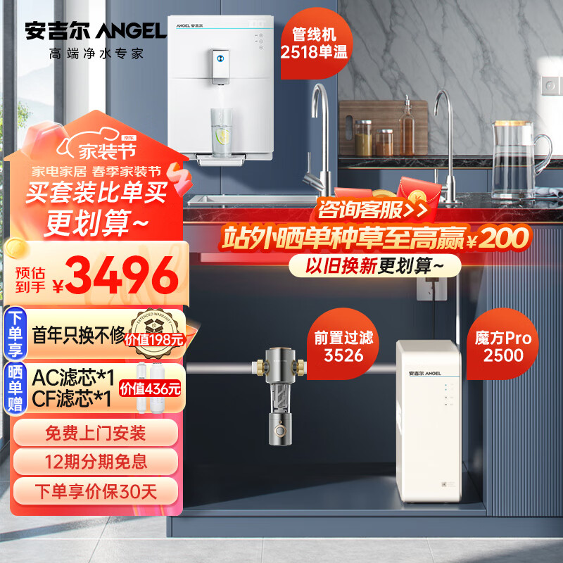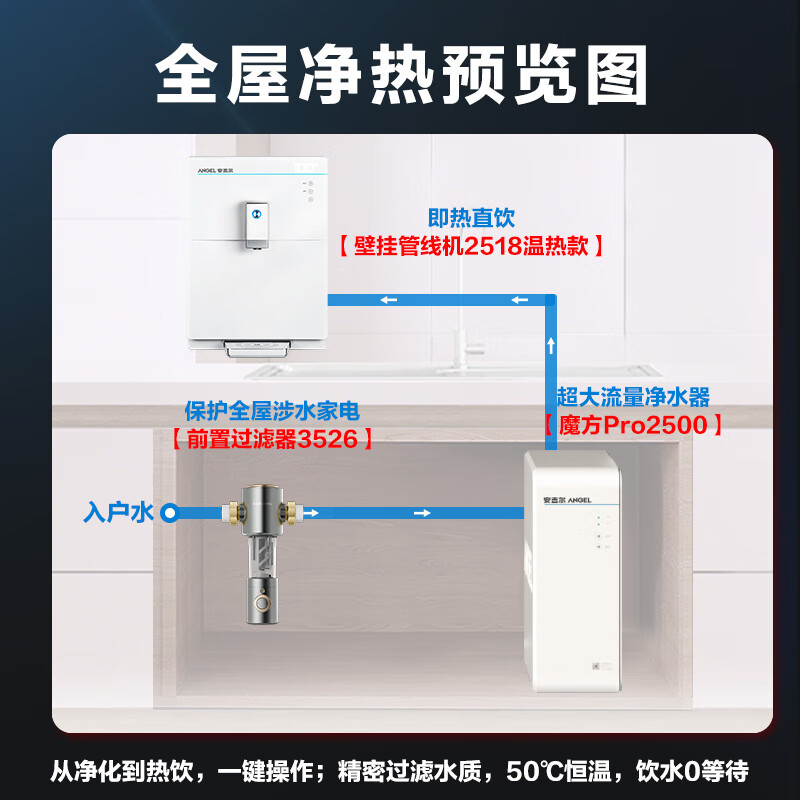 安吉尔魔方Pro2500三件套 净水器pro2500+前置过滤器3526+加热管线机2518价格:3496.00元!