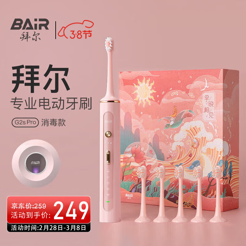 拜尔G2s pro 智能消毒电动牙刷成人震动充电智能声波学生情侣全自动男士女送朋友礼盒装 38节礼物价格:259.00元!