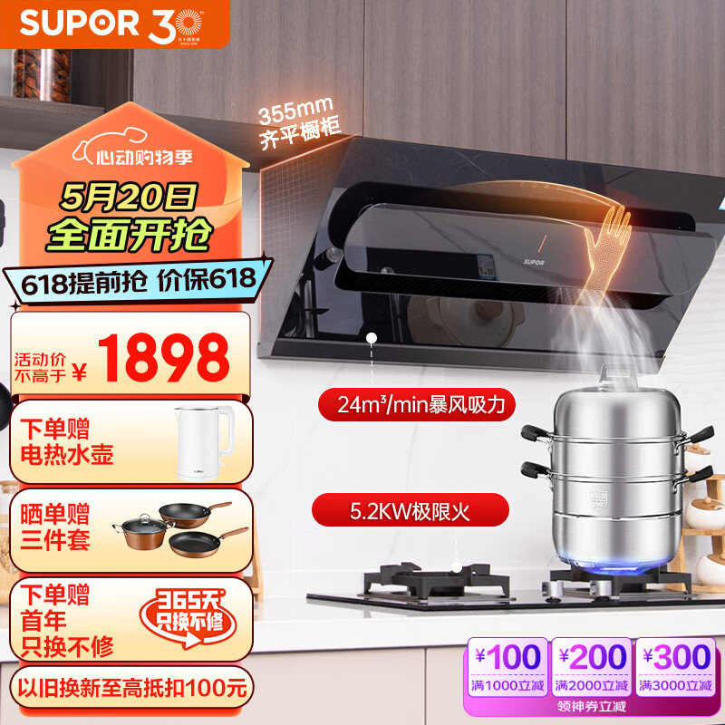 苏泊尔(SUPOR)抽油烟机 24m3/min大吸力 变频侧吸式脱排抽吸油烟机家用 挥手智控免拆洗烟灶套装 DJ50S+DB28液价格:1898.00元!