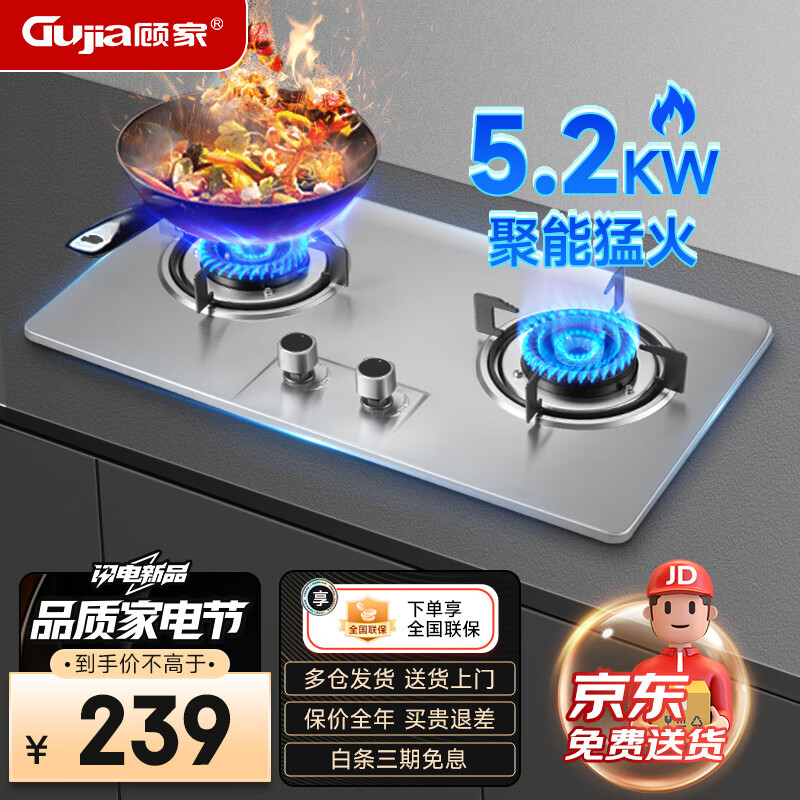 顾家(Gujia)燃气灶双灶大火力家用台式嵌入式两用不锈钢炉具一级能效猛火灶JZT-A13S价格:339.00元!