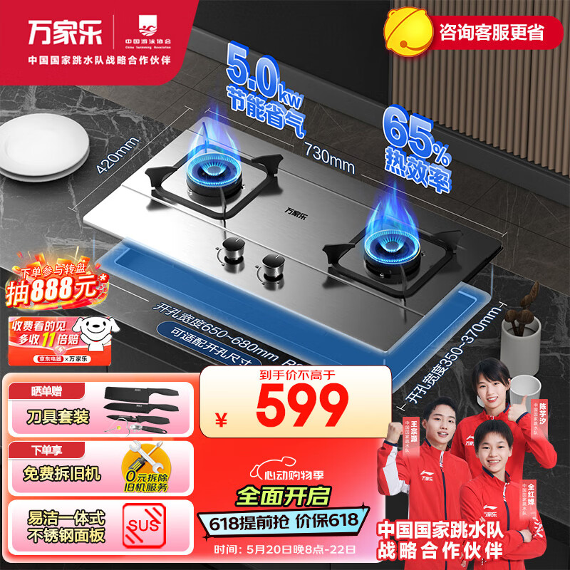 万家乐燃气灶 5.0kW大火力天然气灶猛火灶 不锈钢燃气灶 台嵌两用双灶 家用燃气灶具JZT-KV061天然气价格:699.00元!