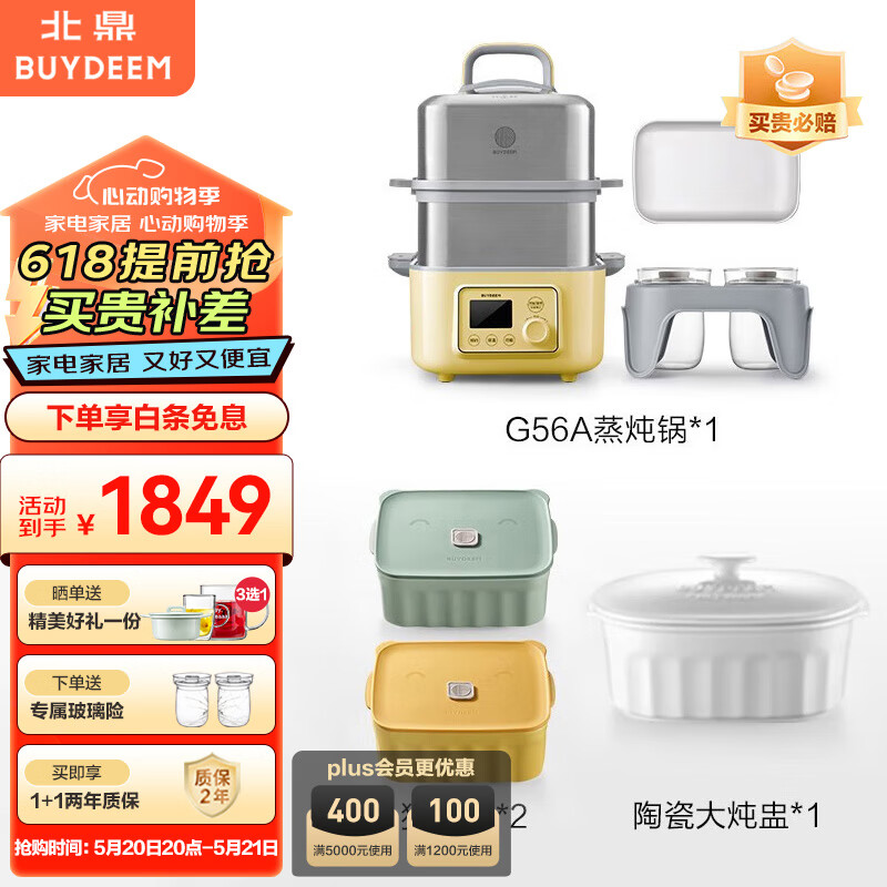 北鼎(Buydeem)电蒸锅 家用一体多功能蒸炖锅 可预约电蒸锅 全家福(小鹅黄G56A+猪猪盒*2+陶瓷大炖盅)价格:1849.00元!
